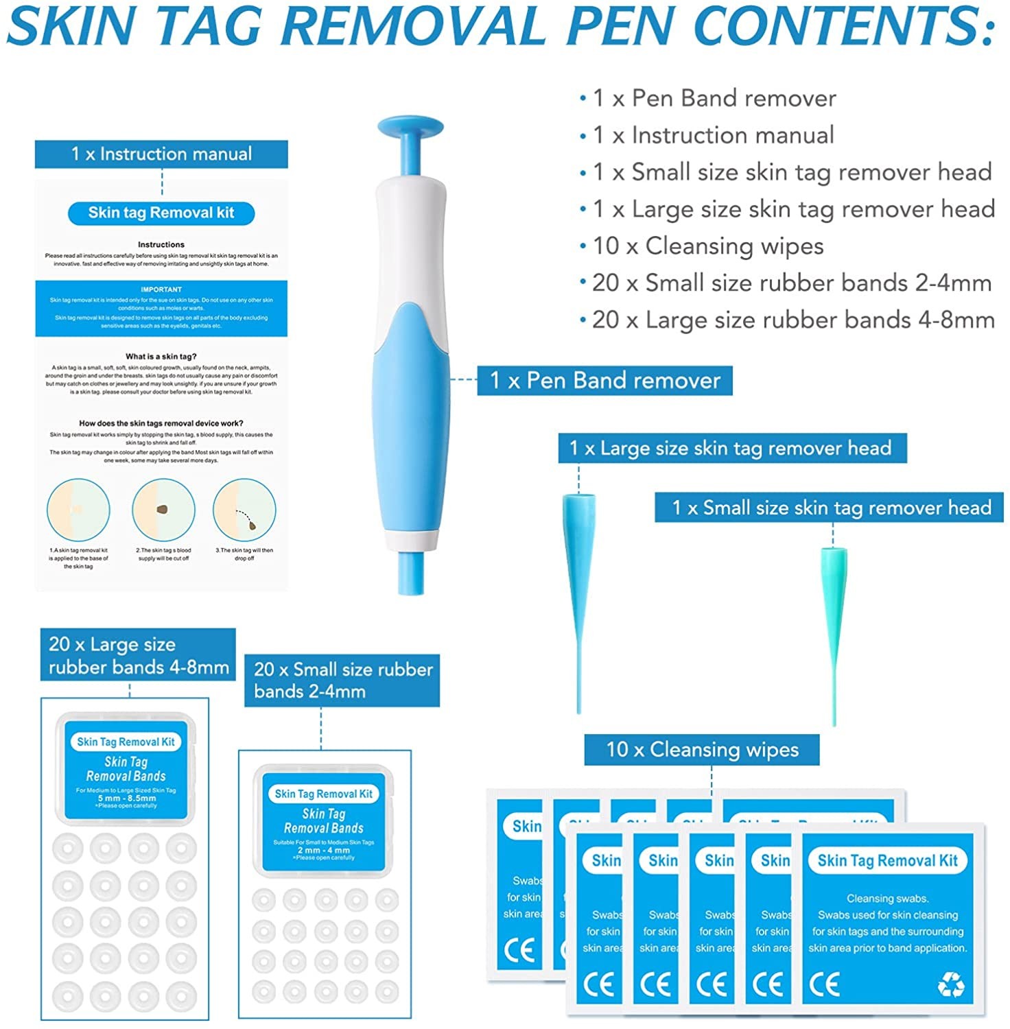 【注意】任何對橡膠過敏的人都不要使用它們。該套件不適用於疣或痣。請勿嘗試處理內部皮膚標籤或敏感區域(如眼睛)周圍的皮膚標籤。