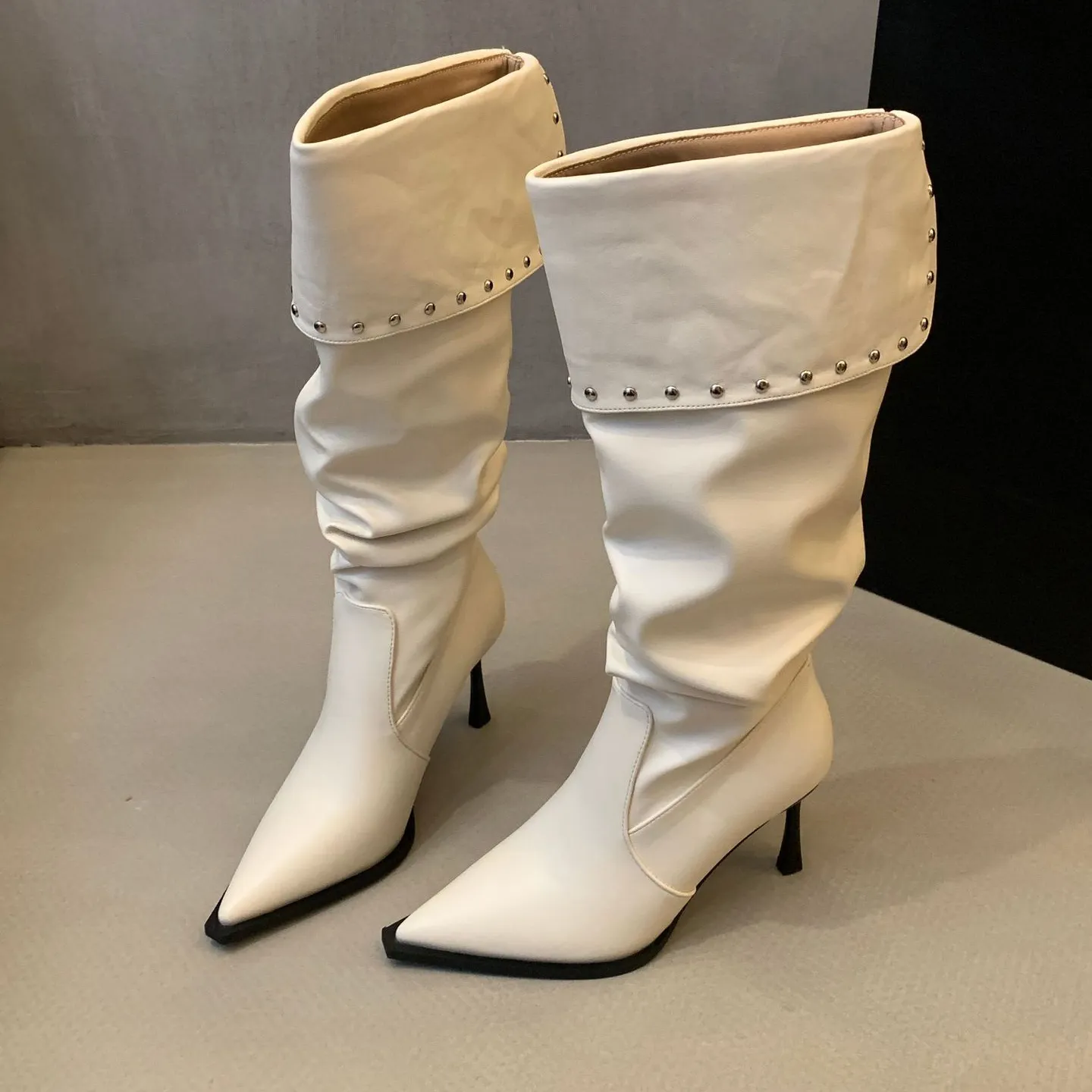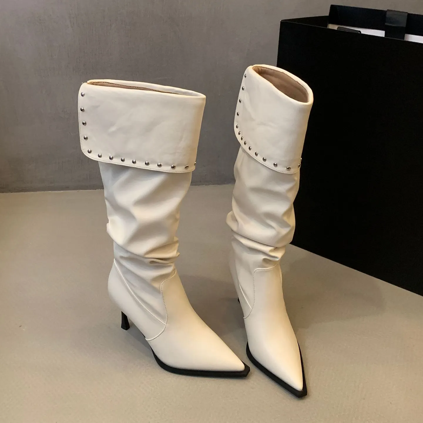 2024 New Fashion Rivets Waterproof Winter Women's Knee-High Square Heel Knight Boot Soft Comfortable Pointed Toe Long Boot
