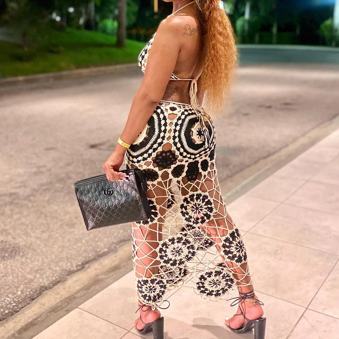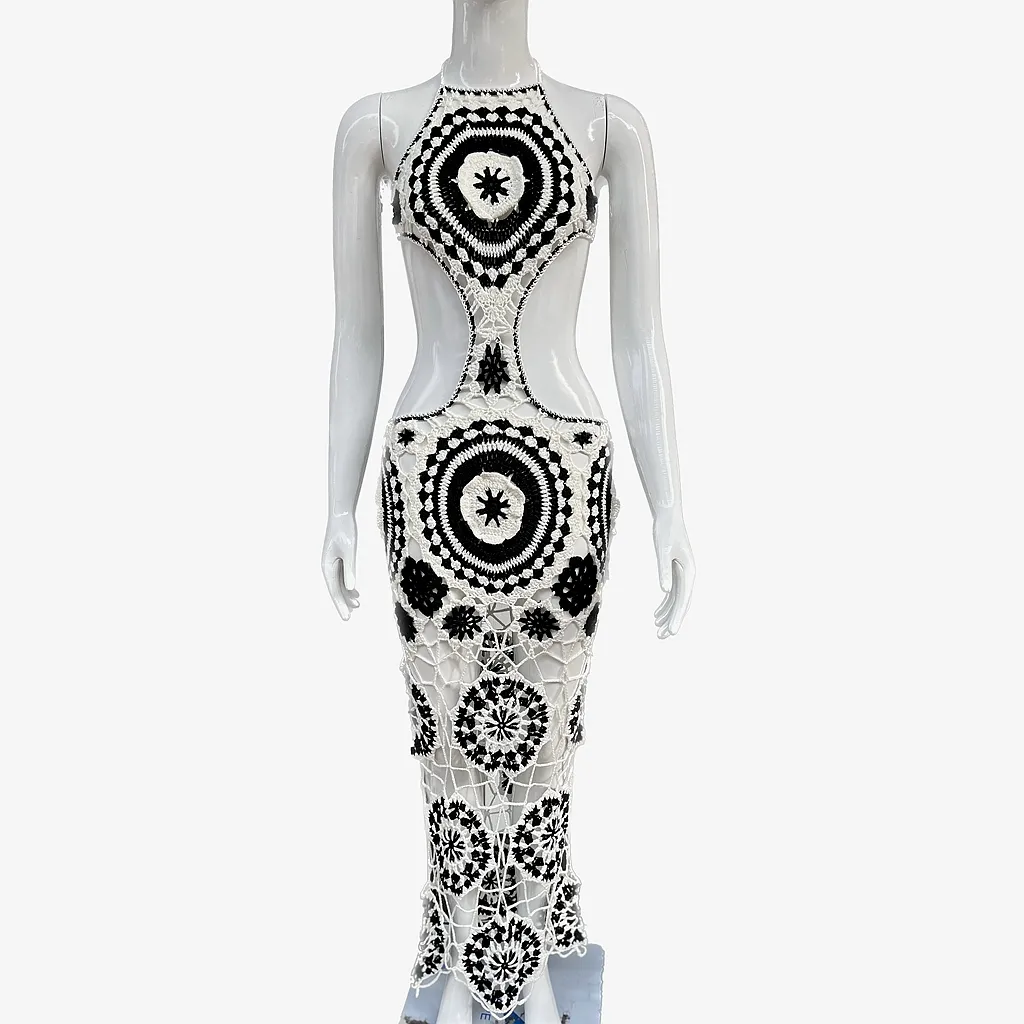 2024 Women Party Halter Backless Dresses Hollow Out Sexy Lolita Fashion Summer Vacation Handmade Crochet Long Knit Madi Dresses