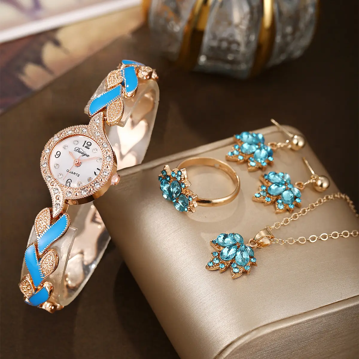 5PCS/Set Women's Watch Fashion Arabic Dial Simple Dial Hollow Strap Quartz Watches Rhinestone Crystal Maple Leaf Jewelry Set