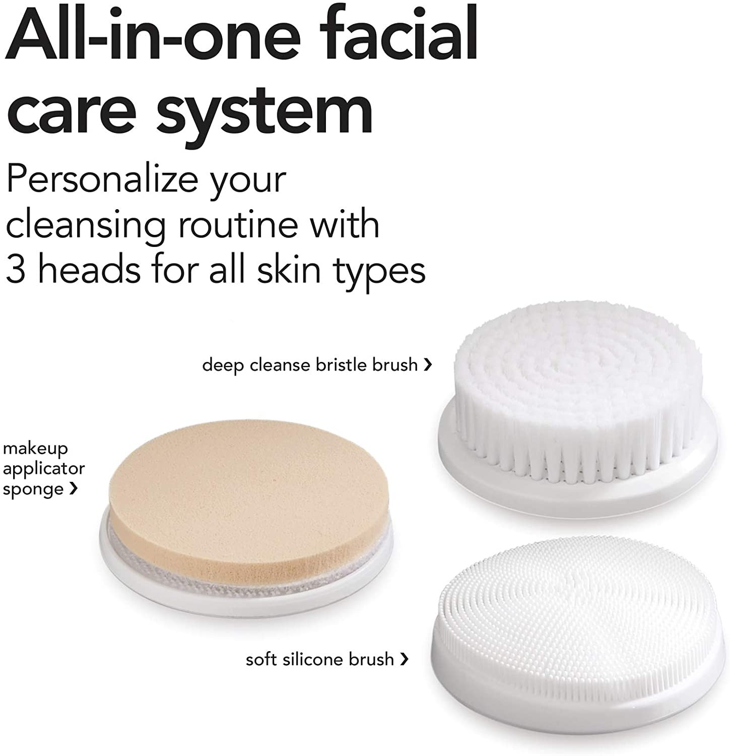 多合一面部護理系統:電動洗臉器包括 3 個適合所有皮膚類型的刷頭:適合乾性和敏感皮膚的矽膠刷、適合中性和油性皮膚的軟刷和化妝海綿。