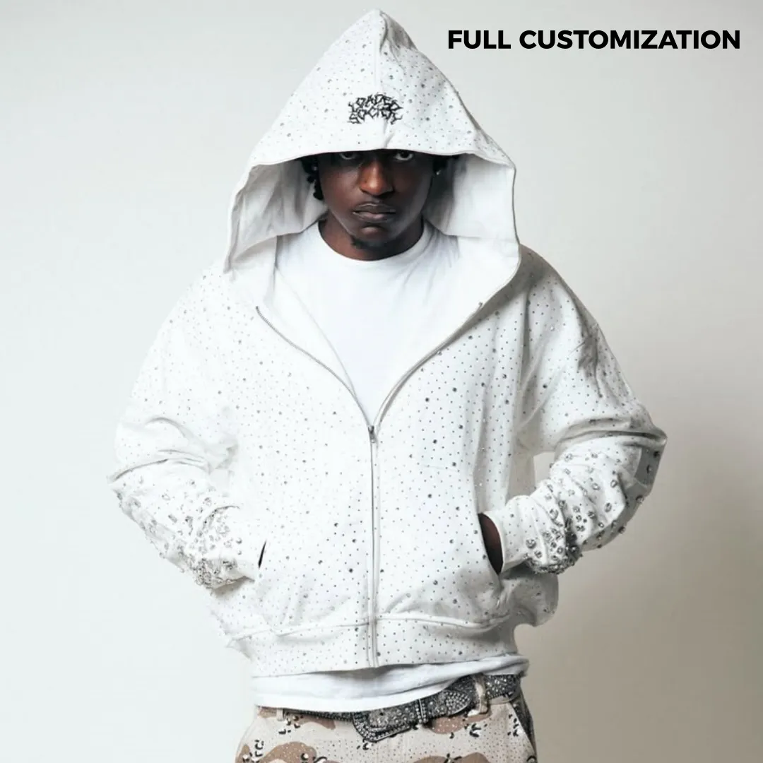 Custom Distressed Boxy Fit Zip up Hoodies ส่วนบุคคลเฮฟวี่เวท Streetwear Hip Hop Rhinestone Unisex Hoodies สำหรับผู้ชาย