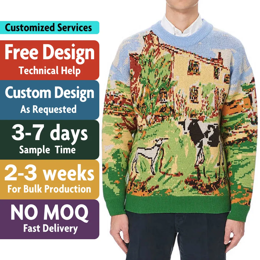 Custom LOGO OEM Men Sweater Jacquard Pattern Knitwear Winter Pullover Jumpers Casual Cotton Knitted Top Custom Crew Neck Sweater