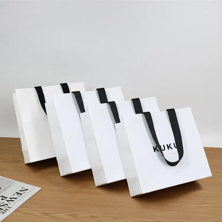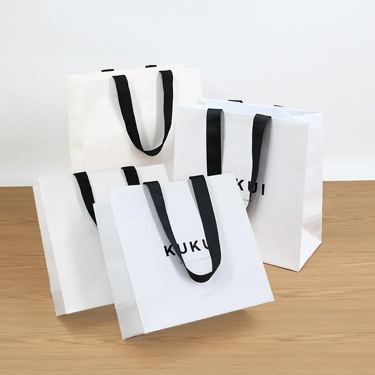 Custom Luxury Gold Foil Matte Embossed Laminated Paper Bag Logo Large Medium White Gift Sturdy Paper Clothing Store Shopping Bag