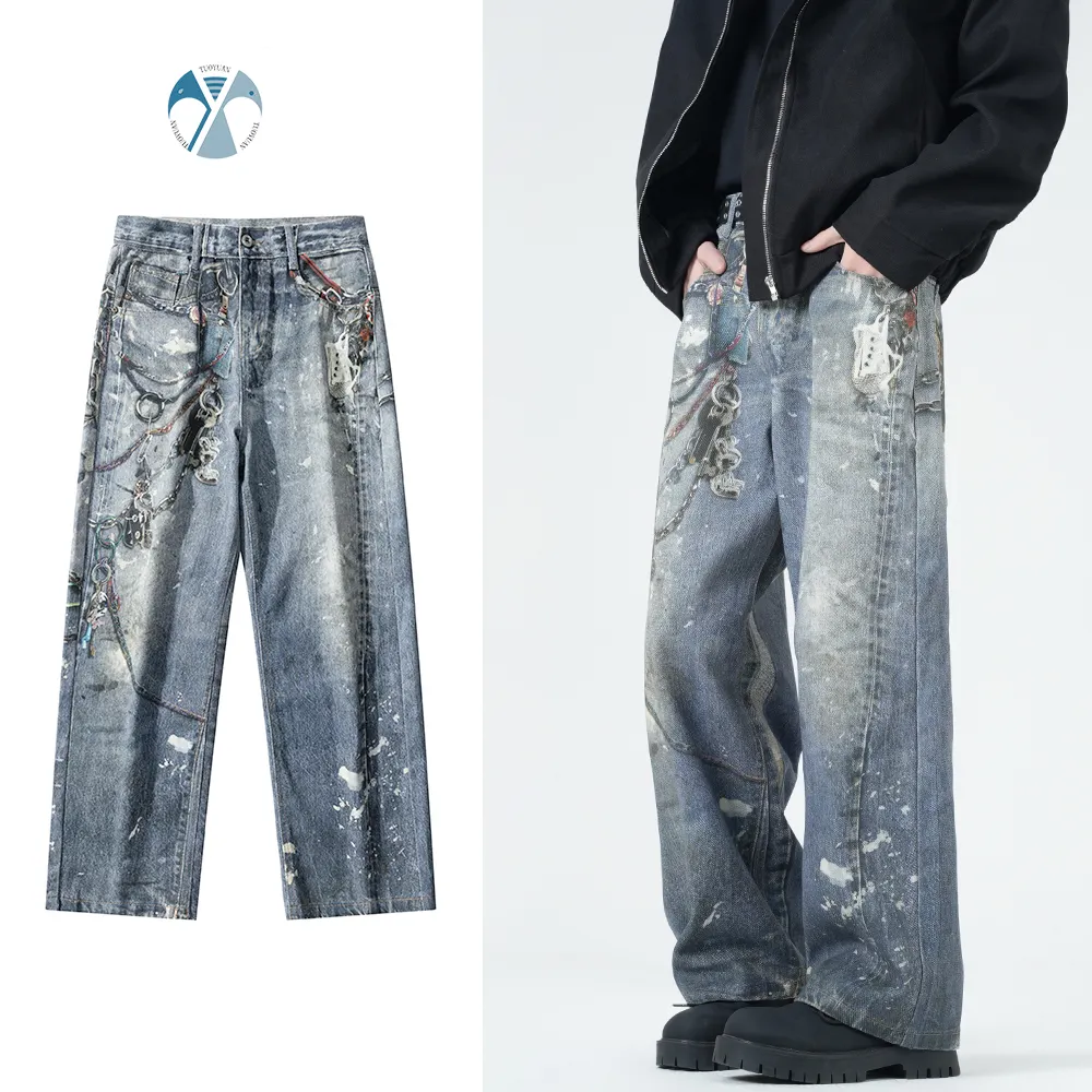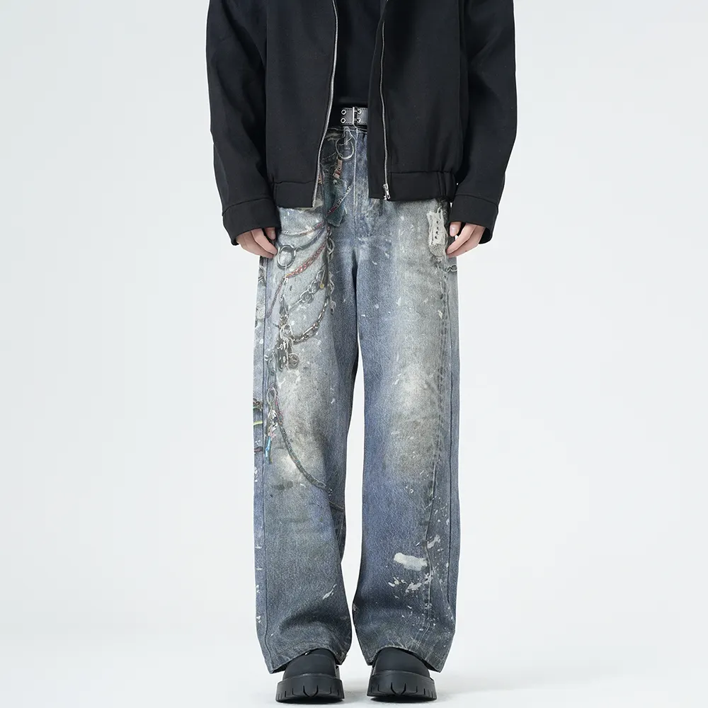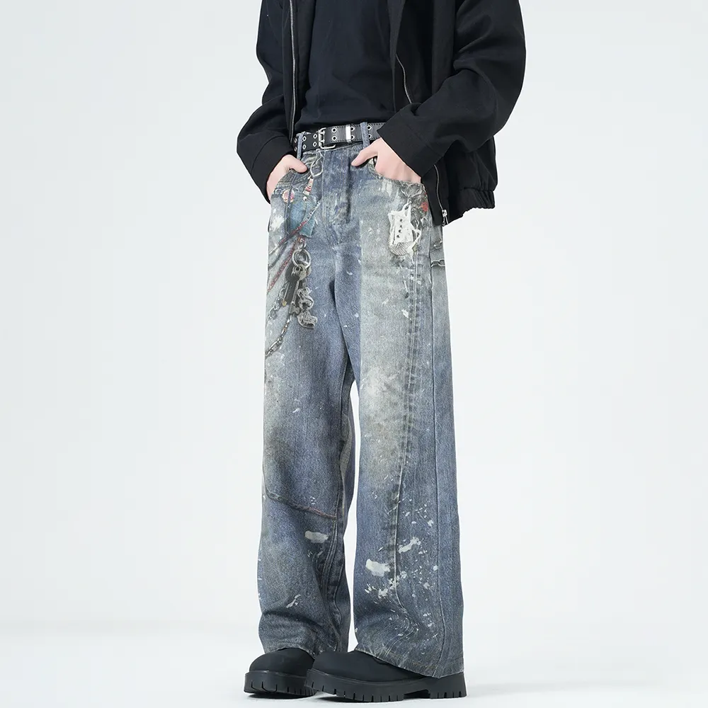 แฟชั่นวินเทจที่กำหนดเอง 3D การพิมพ์ดิจิตอลตรงขากว้างกางเกงยีนส์ผู้ชายถุงขายส่งสำหรับสวมใส่ทุกวัน