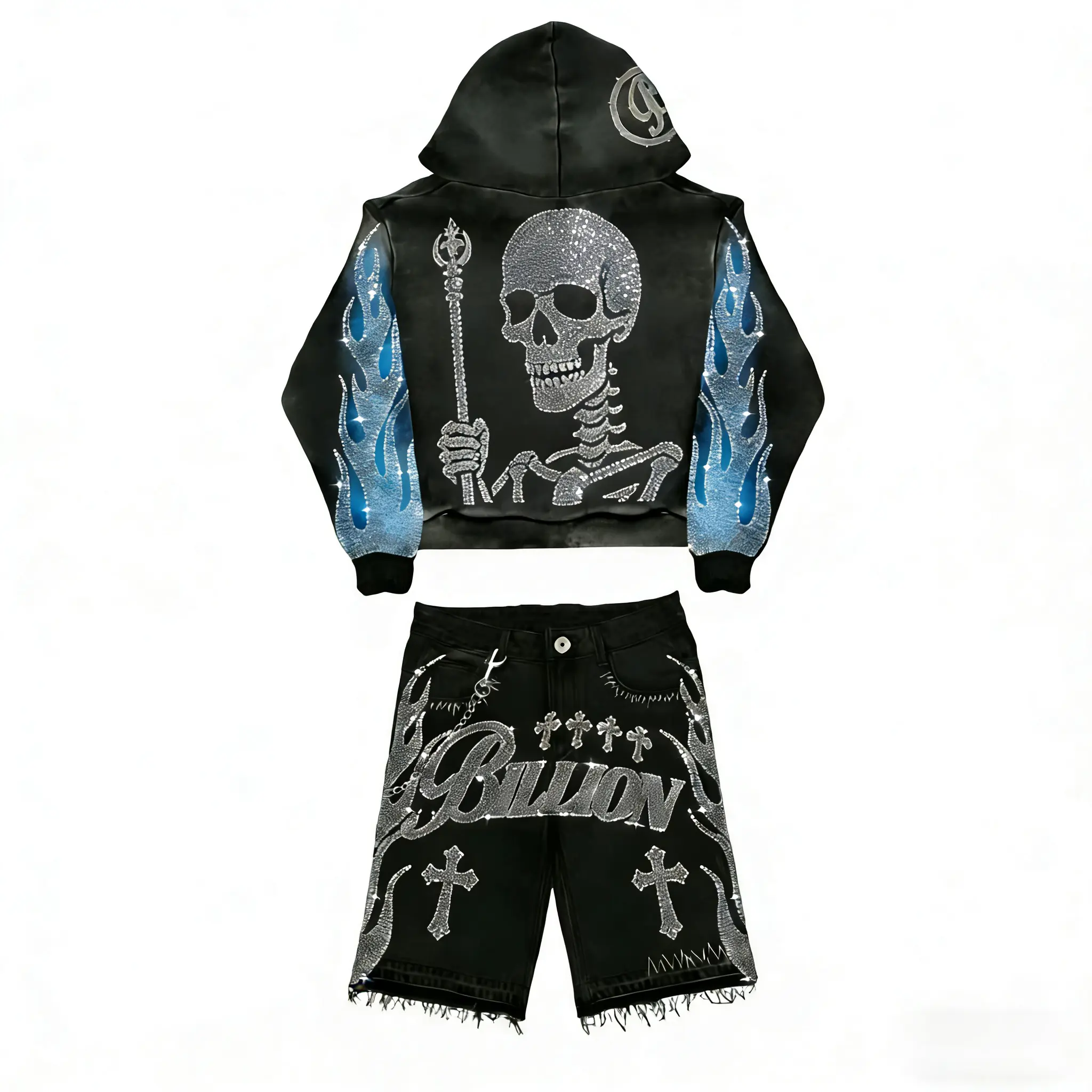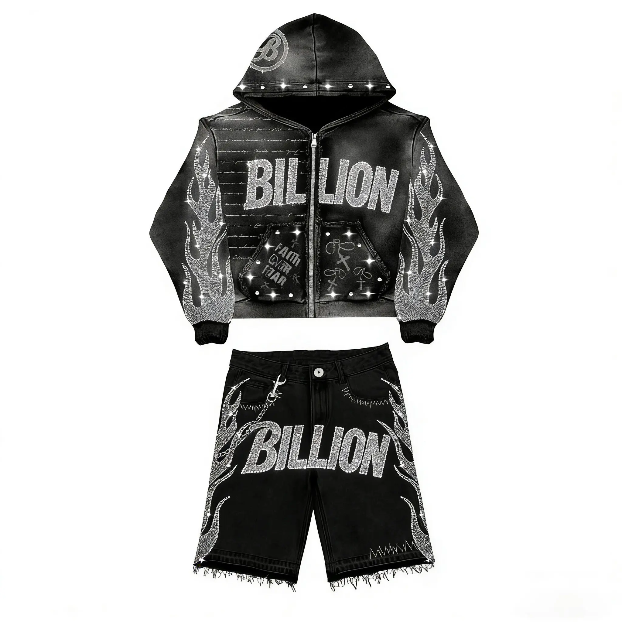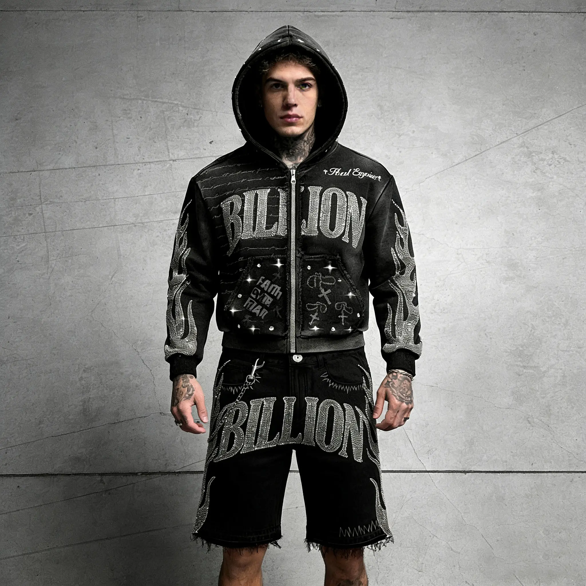 Custom Vintage Sun Faded Heavyweight Streetwear เย็บปักถักร้อย Cropped Acid Wash Rhinestone Distressed Zip up Hoodie สำหรับชาย