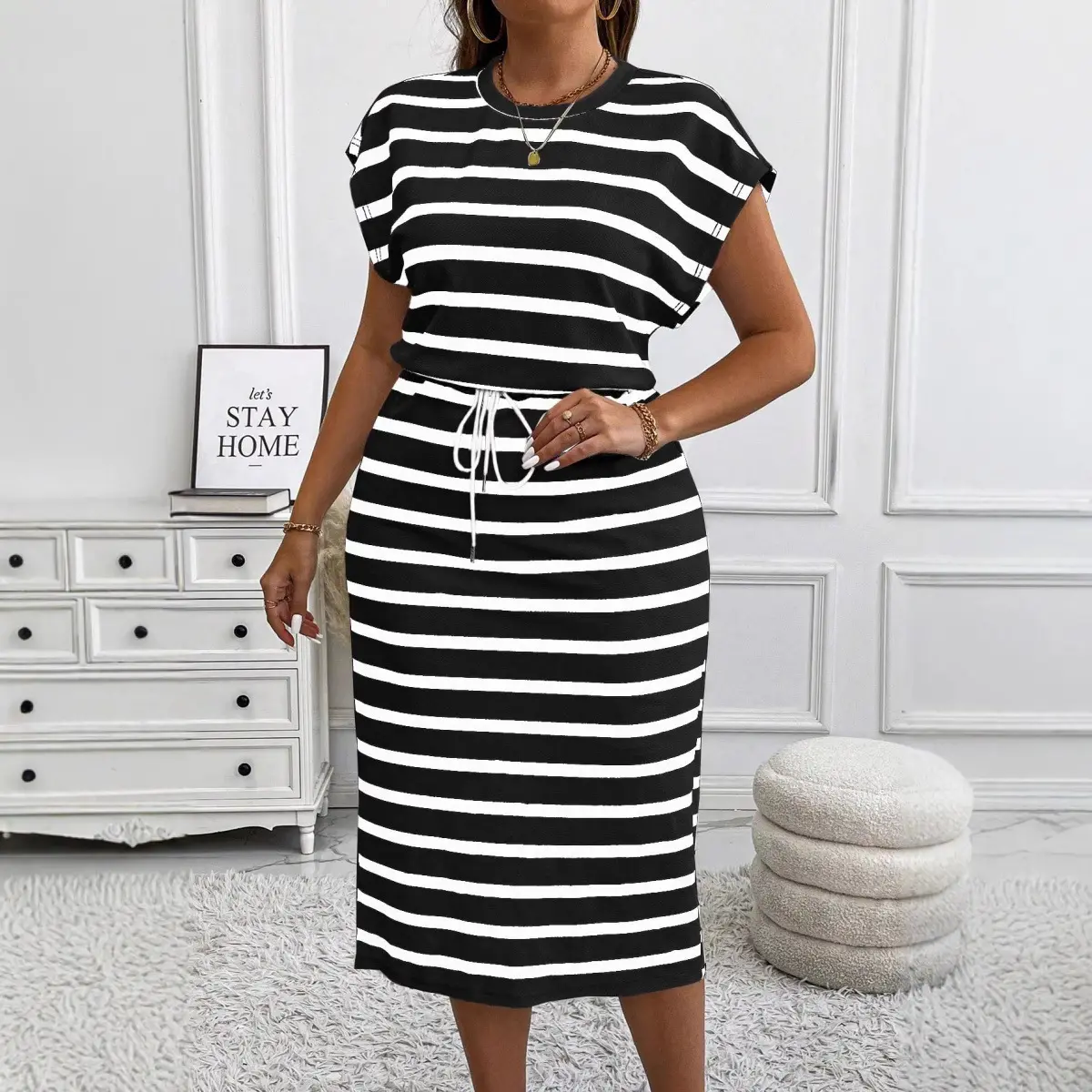 European American Women's Clothing for AliExpress Independent Station Large Size Regular Sleeve Striped Dress