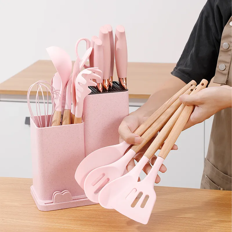 เกรดอาหาร 19 ชิ้นซิลิโคนชุดเครื่องครัวพร้อมที่จับไม้เครื่องมือทำอาหารตัดบอร์ดเก็บถังชุดอุปกรณ์ครัว