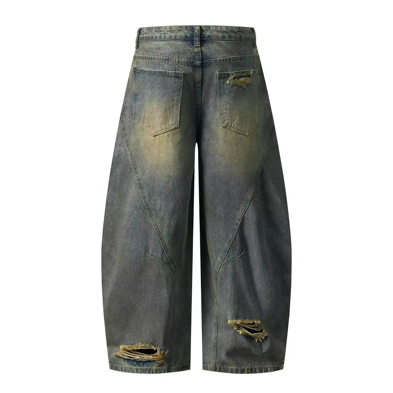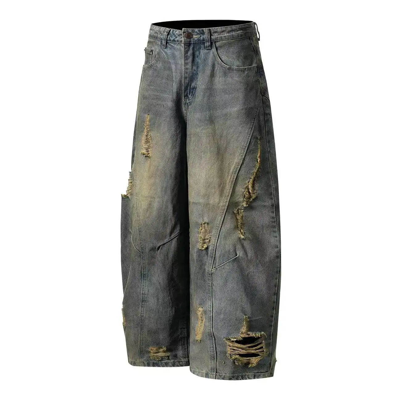 High Quality Custom Unisex Jeans American Retro Ripped Washing Baggy Wide-leg Banana Knife Pants Jeans for Men