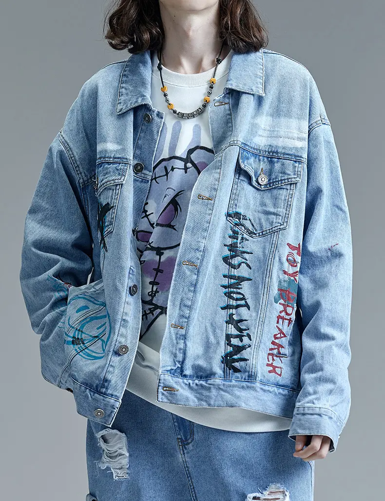 แจ็คเก็ตยีนส์คุณภาพสูงสุดพิมพ์ดิจิตอลแบบกำหนดเอง MOQ ต่ำสำหรับผู้ชาย