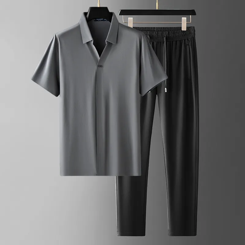 Men's Summer 2-Piece Fashion Set Quick-Drying Black Business Collar Shirt & Elastic Loose Pants Casual Business Style