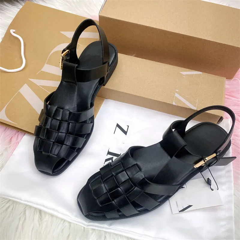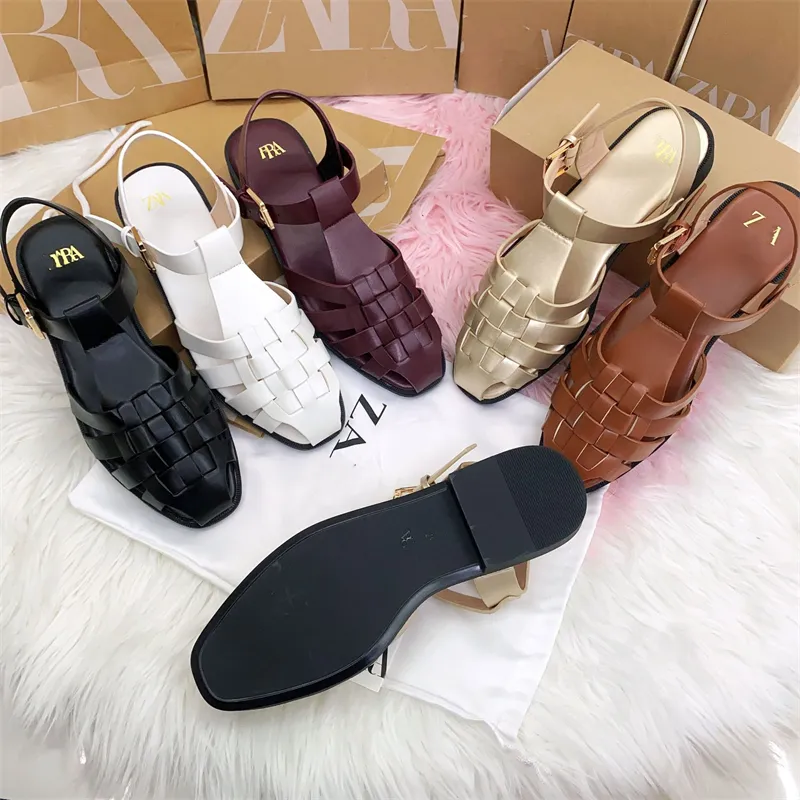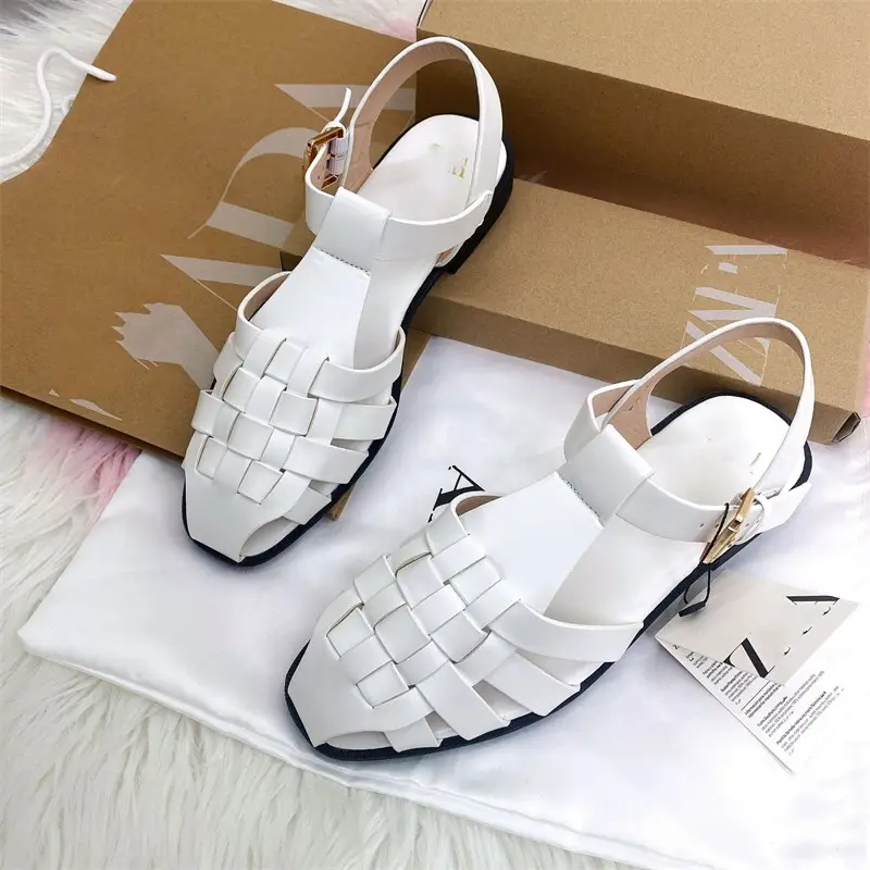 ออกแบบใหม่ผู้หญิงรองเท้าแตะโรมันหญิงแฟชั่นฤดูร้อนกลางแจ้งรองเท้าแตะหนังสายคล้องคอผู้หญิงทอรองเท้าแตะแบน