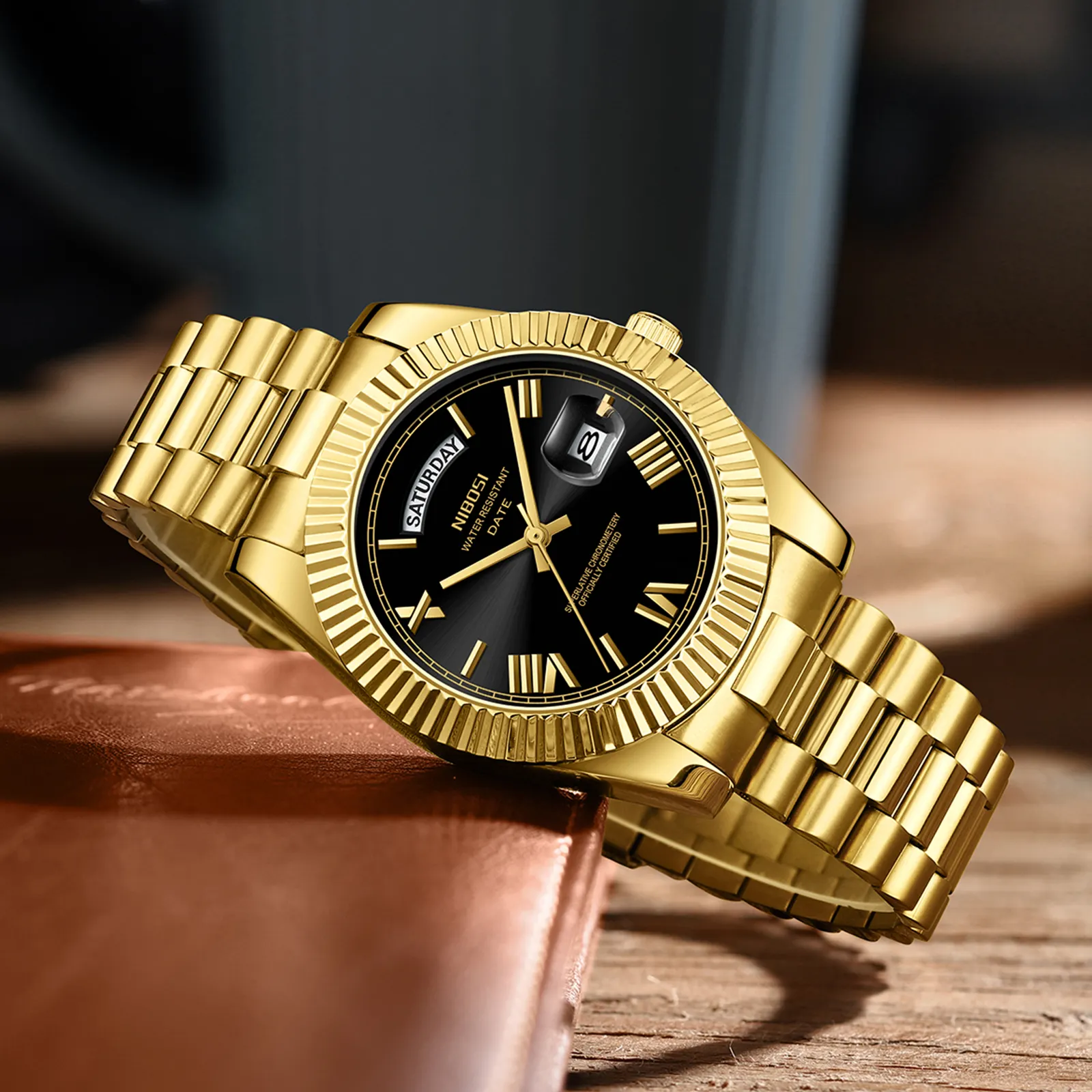 NIBOSI 2628 สแตนเลสสตีลเงินมัลติฟังก์ชั่เวลาสีเขียว Dial 40 มม.นาฬิกาผู้ชายแบรนด์หรูควอตซ์นาฬิกาสำหรับชาย