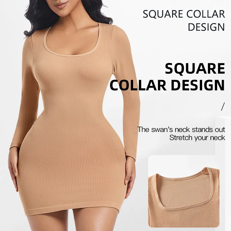 ชุดสลิปสำหรับผู้หญิงสลิปเต็มสำหรับภายใต้เดรสชุดกระชับสัดส่วนควบคุมหน้าท้องแขนยาวพร้อมร่องด้านหลัง