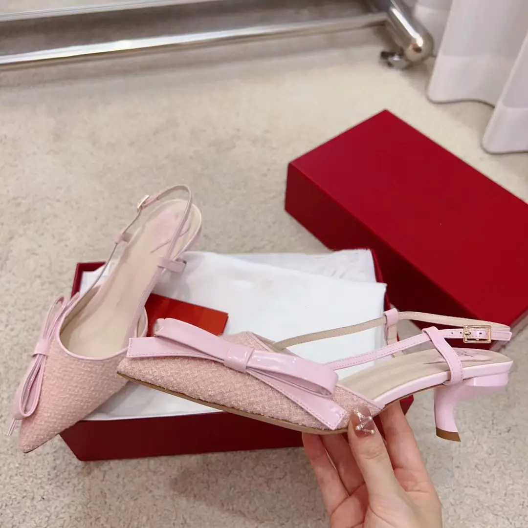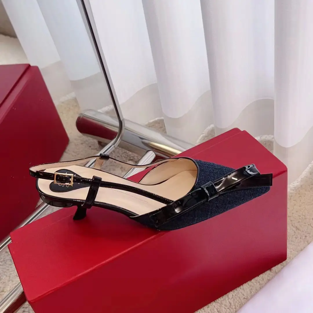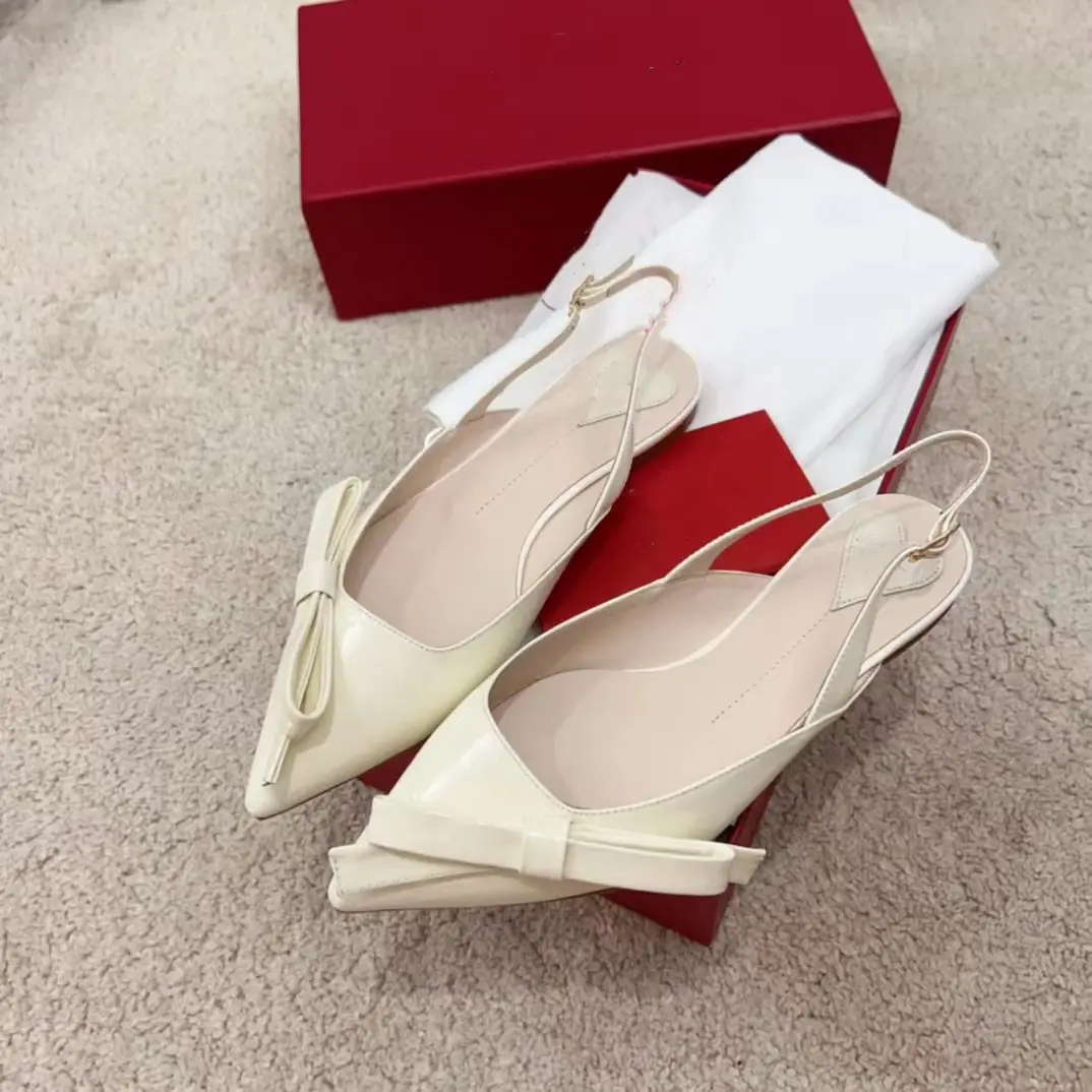 ฤดูใบไม้ผลิ/ฤดูร้อนหนังสิทธิบัตรชี้สีบล็อกโบว์ผู้หญิงรองเท้าแตะปากตื้นส้นลูกแมวกลางอากาศติดตามรองเท้า