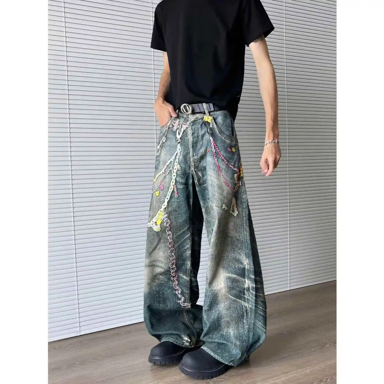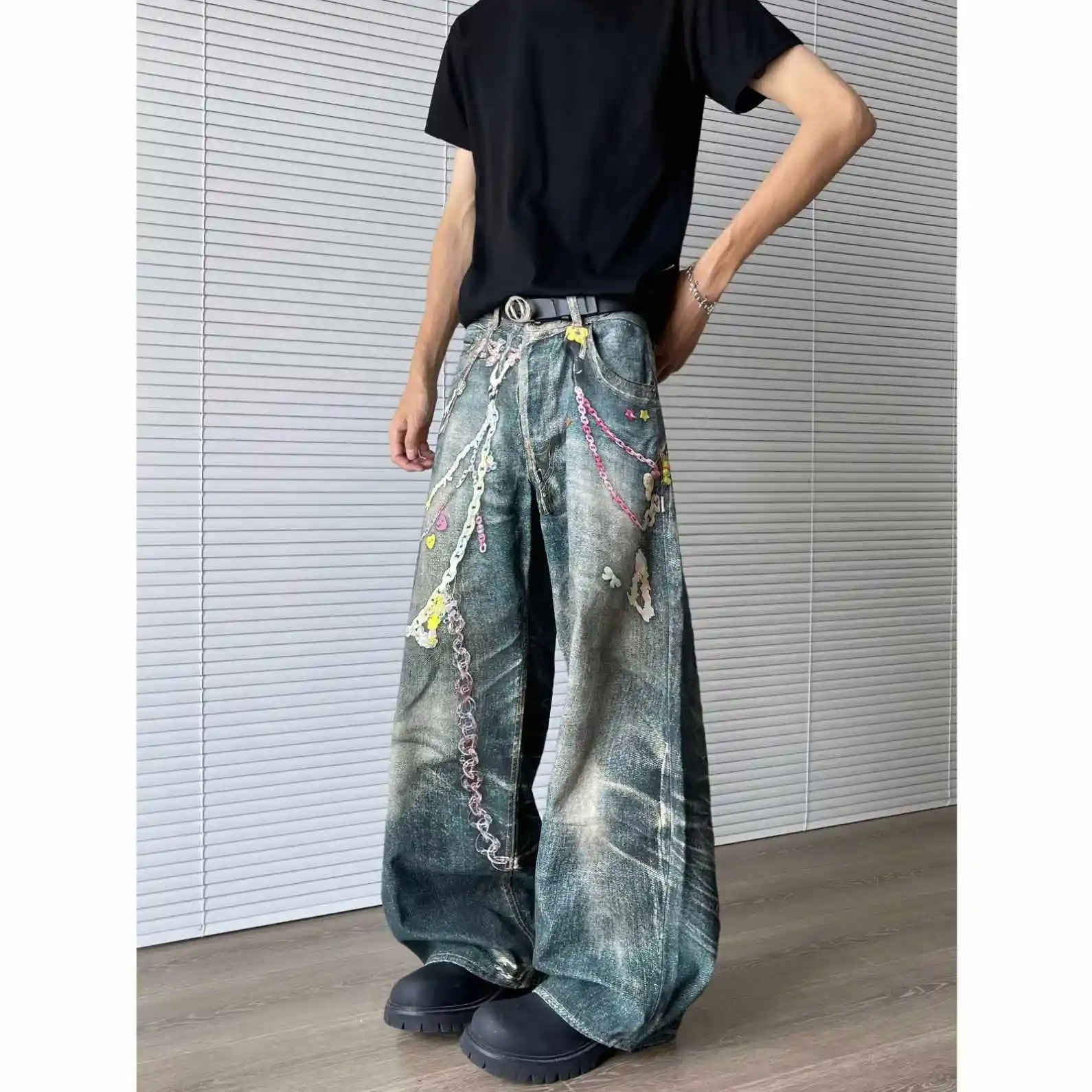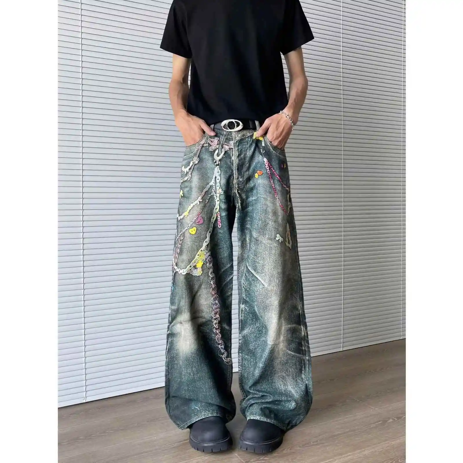 ตรงกางเกงยีนส์ High Street DENIM ผ้าฝ้าย 100% Stonewashed 3D การพิมพ์ดิจิตอลล้าง Y2K VINTAGE Quick แห้งฤดูใบไม้ร่วง/ฤดูหนาว