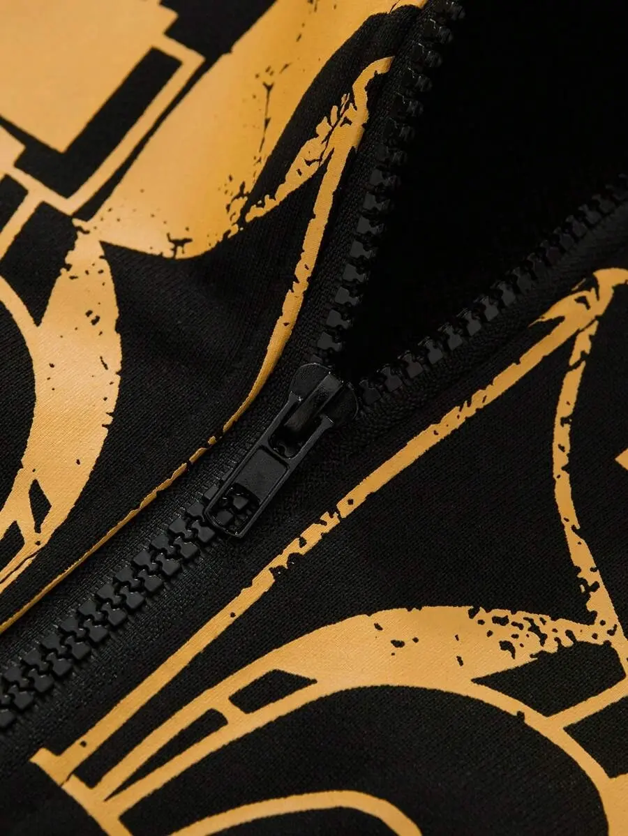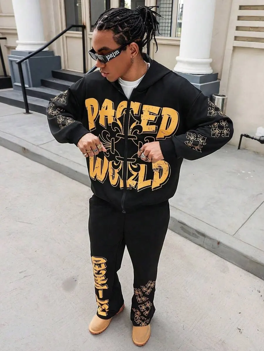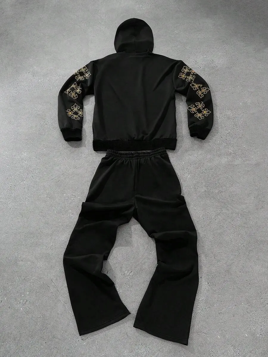 Streetwear Manufacturer Custom Oversized Cross Graphic Printed 2 Piece Sweatsuit Casual Zip Men's Boxy Hoodie Sweatpants Set