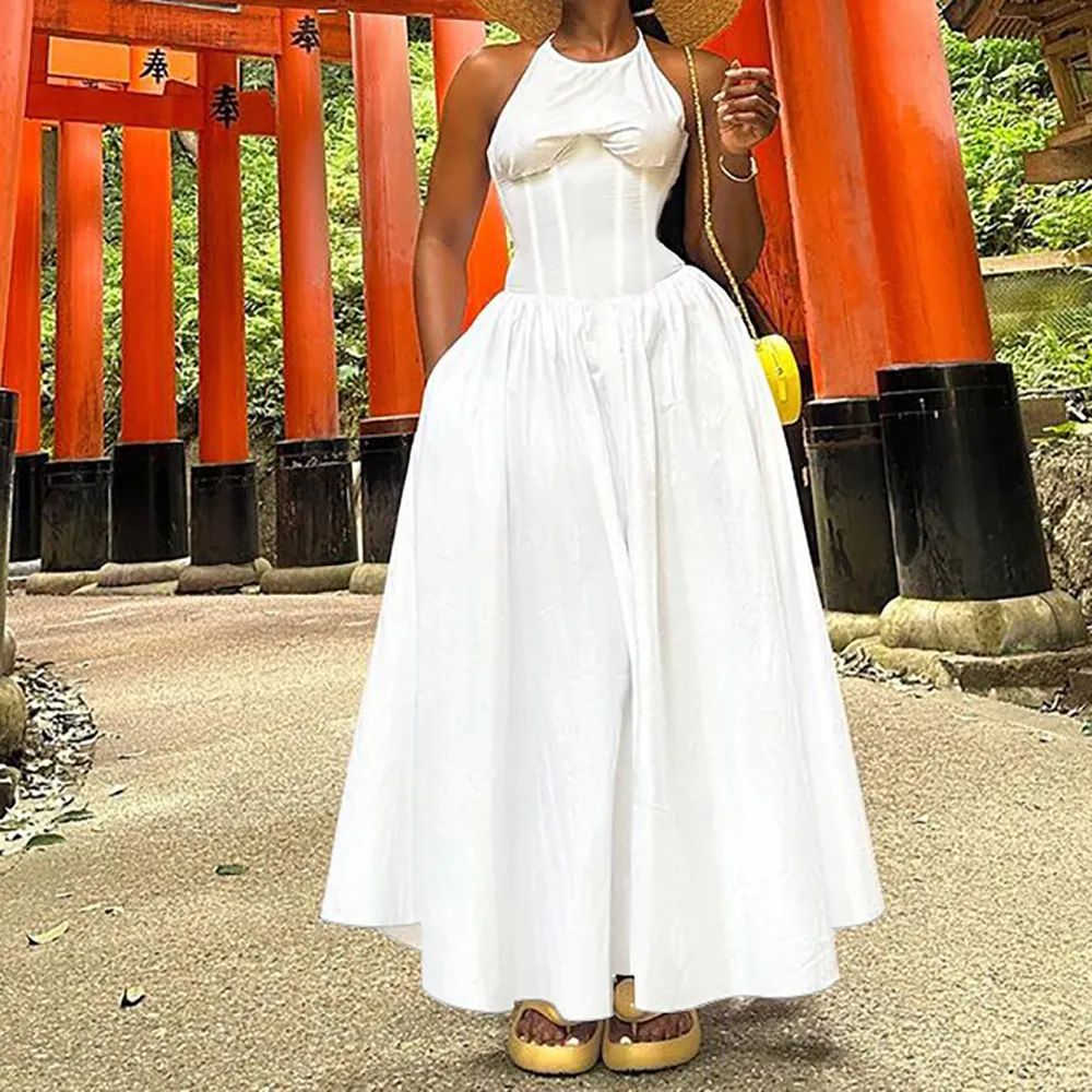 Summer Dinner Ladies Latest White for Girls Fishbone New Sexy Slit Dress European Style Elegant Halter Neck Sleeveless Dress