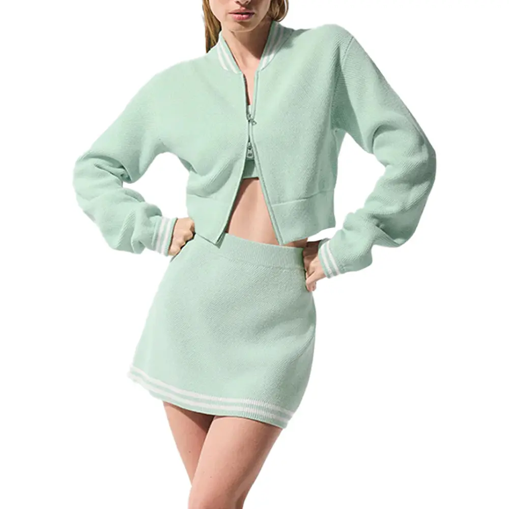 ขายส่งที่กำหนดเองผู้หญิงชุดถักบล็อกสีผ้าขนสัตว์ผสม Zip-Up วาฟเฟิลถักกีฬา Streetwear คุณภาพสูงมีสไตล์เสื้อกันหนาวชุด