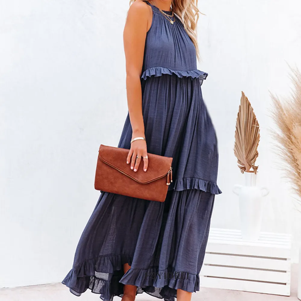 Wisrise Fashion Custom Wholesale Irregular Cake Natural Waist Solid Breathable Elegant Beach Sleeveless Halter Maxi Dress