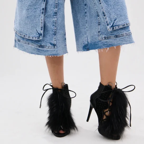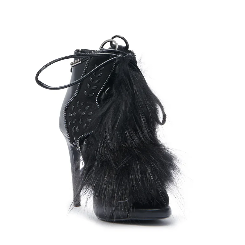 ผู้หญิงสีดำFaux Fox Fur Peep Toe Stilettoส้นข้อเท้ารองเท้าแตะLace-Up Design Punkสไตล์รองเท้าแตะสำหรับสตรี