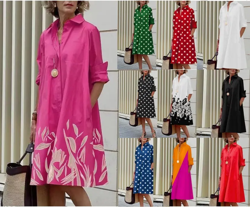 Women's Clothing New Ladies Dresses Women Lady Elegant Temperament Lapel Midi Print Simple Short Sleeves Shirt Dress