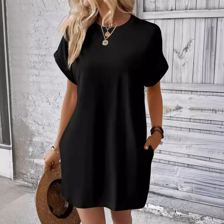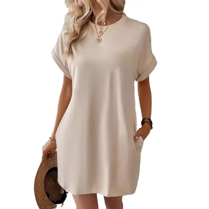 Women's Clothing Women's New Casual Cotton Dress with Round Neck Bat Sleeve Invisible Pocket Solid Color