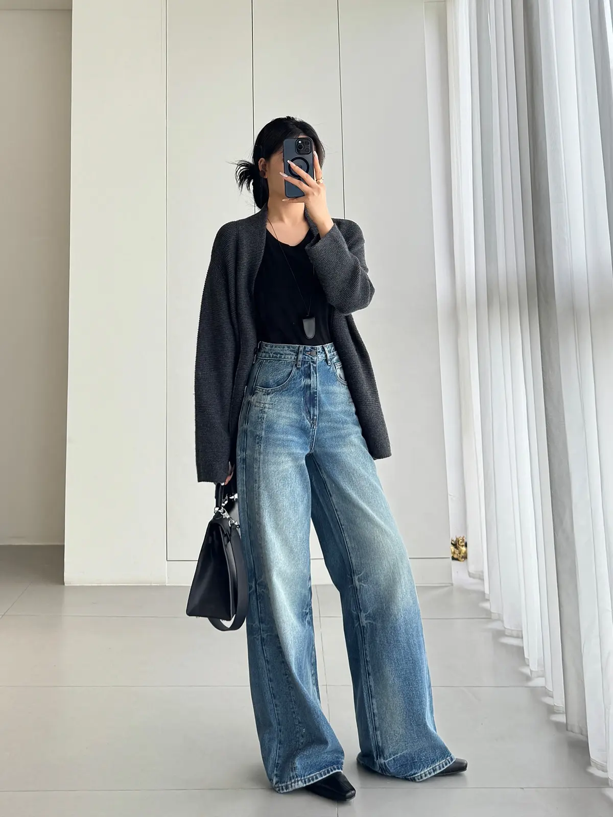 YUANBOFEI Casual Eco-Friendly Breathable High Waist Boyfriend-Style Wide Leg Baggy Blue Straight-leg Denim Jeans for Women